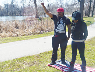Vaun Mayes pictured with Gabriel Moses, standing on the flag at Washington Park on Milwaukee’s north side as a protest for racial equality. Photo by Jakayla Phillips.