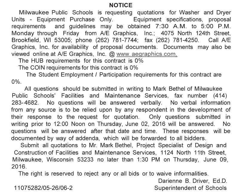 Share: Click to share on Facebook (Opens in new window) Facebook Tweet Click to email a link to a friend (Opens in new window) Email Click to print (Opens in new window) Print MPS Requesting Quotations for Washer and Dryer Units – Equipment Purchase Only May 28, 2016 Share: Click to share on Facebook (Opens in new window) Facebook Tweet Click to email a link to a friend (Opens in new window) Email Click to print (Opens in new window) Print