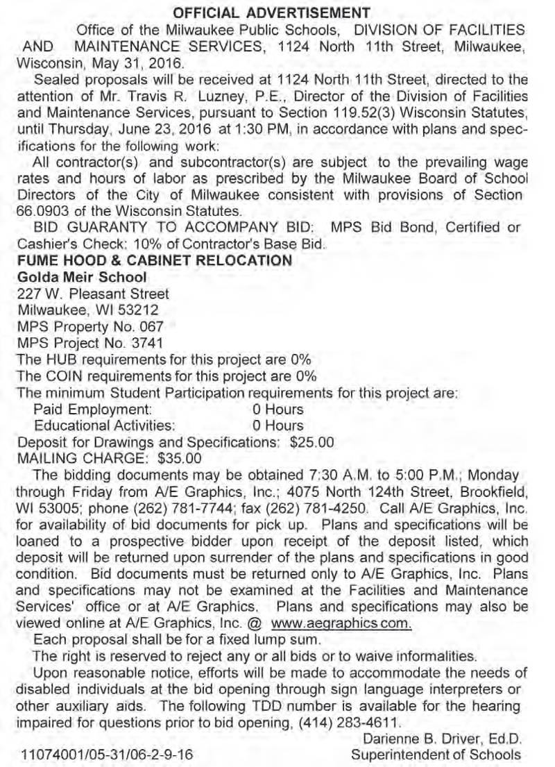 Share: Click to share on Facebook (Opens in new window) Facebook Tweet Click to email a link to a friend (Opens in new window) Email Click to print (Opens in new window) Print MPS Requesting BIDs for Fume Hood and Cabinet Relocation at Golda Meir School June 4, 2016 Share: Click to share on Facebook (Opens in new window) Facebook Tweet Click to email a link to a friend (Opens in new window) Email Click to print (Opens in new window) Print