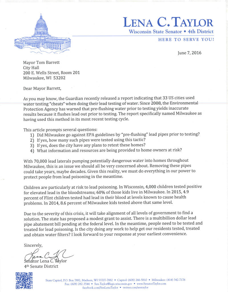 (MADISON) – Last week, an article in The Guardian indicated that Milwaukee is one of at least 33 cities that violated Environmental Protection Agency guidelines when testing water for lead. The story stated that Milwaukee’s practice was to “cheat” the test by flushing the pipes prior to testing. Senator Lena Taylor (D-Milwaukee) yesterday wrote a letter to Milwaukee Mayor Tom Barrett questioning Milwaukee’s lead testing and abatement efforts. Below is Sen. Taylor’s statement on this issue: