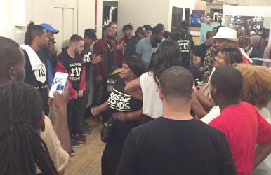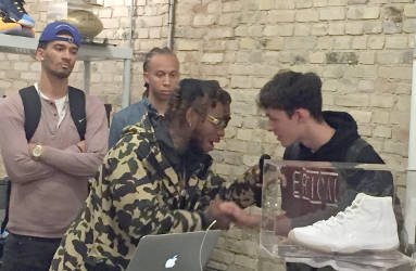 Reggie Bonds talks to a fan during his album listening party at Trusted Kicks in downtown Milwaukee. (Photo by Dylan Deprey)