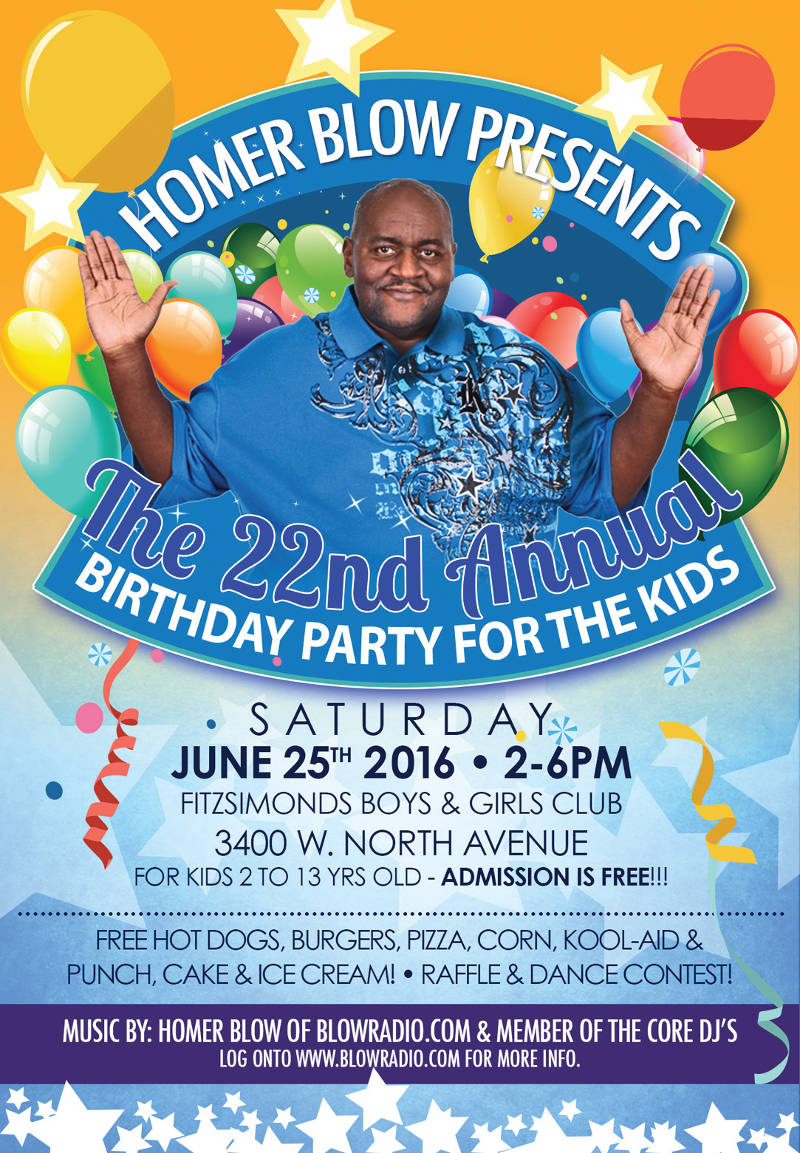 Share: Click to share on Facebook (Opens in new window) Facebook Tweet Click to email a link to a friend (Opens in new window) Email Click to print (Opens in new window) Print Homer Blow Presents The 22nd Annual Birthday Party For The Kids June 18, 2016 Share: Click to share on Facebook (Opens in new window) Facebook Tweet Click to email a link to a friend (Opens in new window) Email Click to print (Opens in new window) Print
