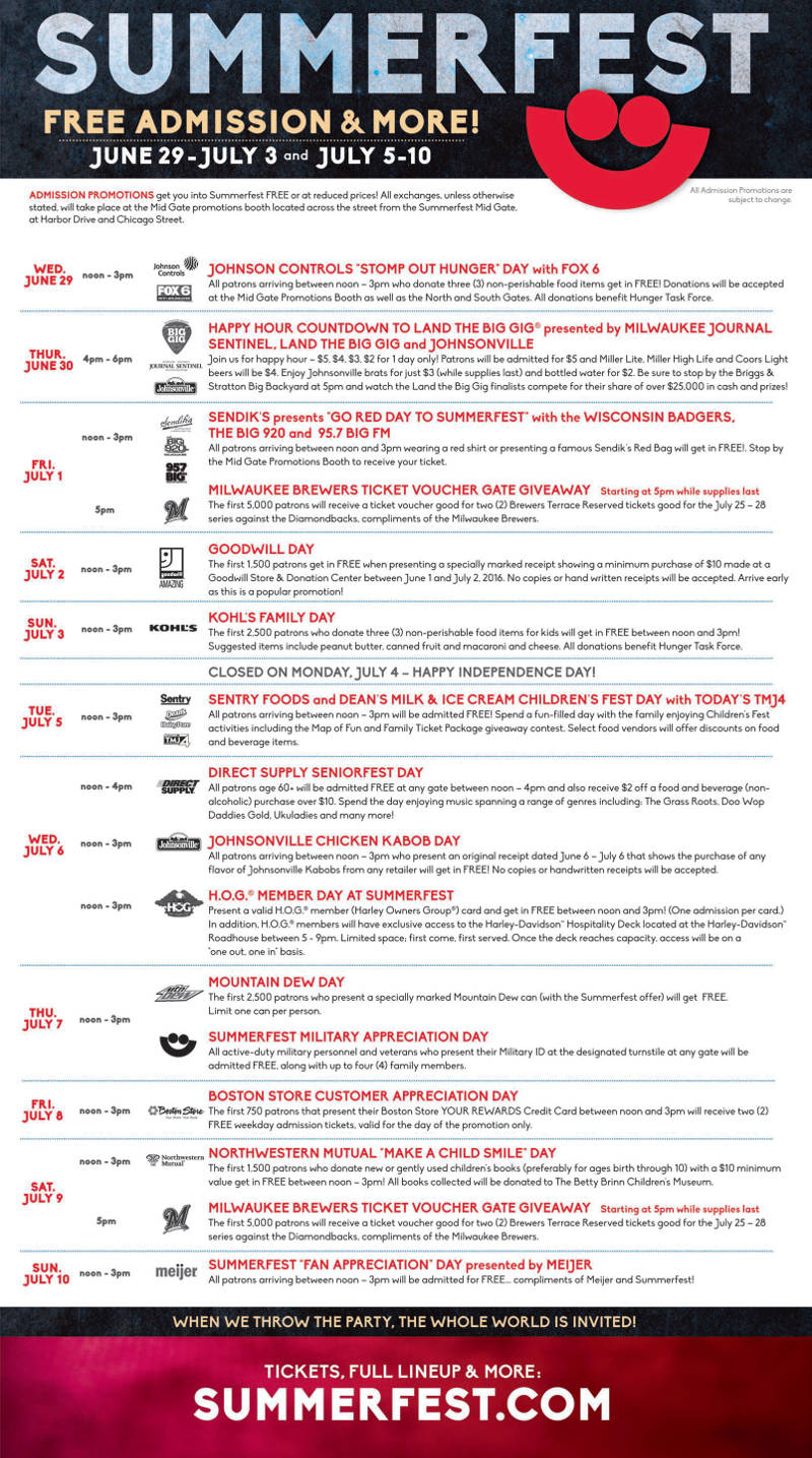 Share: Click to share on Facebook (Opens in new window) Facebook Tweet Click to email a link to a friend (Opens in new window) Email Click to print (Opens in new window) Print Summerfest 2016 Admission Promotions June 25, 2016 Share: Click to share on Facebook (Opens in new window) Facebook Tweet Click to email a link to a friend (Opens in new window) Email Click to print (Opens in new window) Print