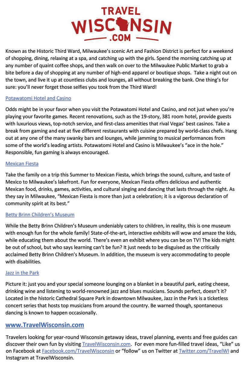 Share: Click to share on Facebook (Opens in new window) Facebook Tweet Click to email a link to a friend (Opens in new window) Email Click to print (Opens in new window) Print Milwaukee Travel Destinations July 2, 2016 Share: Click to share on Facebook (Opens in new window) Facebook Tweet Click to email a link to a friend (Opens in new window) Email Click to print (Opens in new window) Print