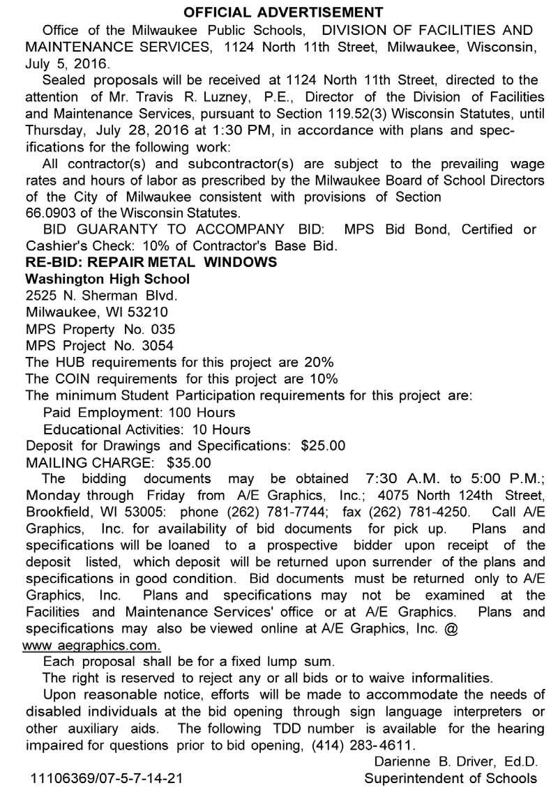 MPS Requesting BIDs for Repair Metal Windows at Washington High School – Rebid