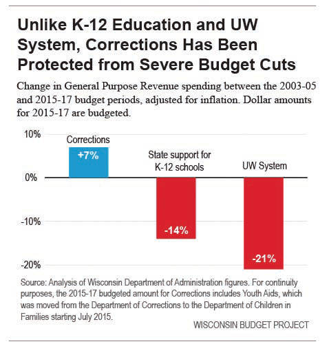 The state spending on corrections in General Purpose Revenue (GPR) has increased 7 percent over the last seven budgets which in contrast to state GPR spending on K-12 school which declined 14 percent and the University of Wisconsin System which declined 21 percent.