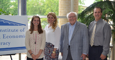 MADISON – Aevalina Gwynne, a financial coach for the Wisconsin Women’s Business Initiative Corp. (WWBIC), attended the National Institute of Financial and Economic Literacy (NIFEL) training July 6-8 at Edgewood College in Madison. The week-long session, “Buy now! Pay later! Nothing down!,” focused on equipping educators with the tools they need to teach students about credit, one of the most widely used but often-abused financial tools in existence. Pictured, left to right, are: Gwynne; Erin Bykowski, Edgewood’s Director of Financial Literacy Services; William Wilcox, Treasurer of the Wisconsin Jump$tart Coalition for Personal Financial Literacy and President of CBM Credit Education Foundation Inc.; and David Mancl, Director of the Office of Financial Literacy at the Department of Financial Institutions (DFI).