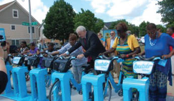 Mayor Tom Barrett tries out a Bublr bike with some Milwaukee Housing Authority residents at the ceremony that announced HACM’s partnership with Bublr Bikes and Dreambikes. Photo By Bublr Bikes