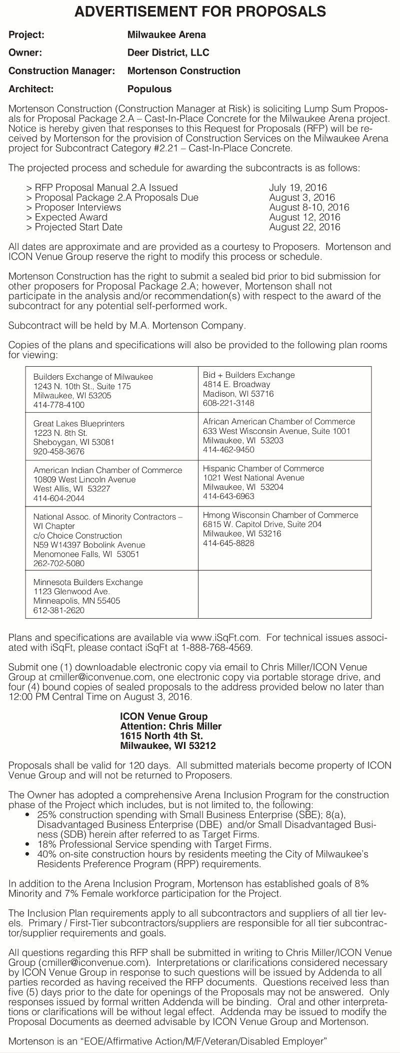Share: Click to share on Facebook (Opens in new window) Facebook Tweet Click to email a link to a friend (Opens in new window) Email Click to print (Opens in new window) Print Mortenson Construction Requesting Proposals for Cast-In-Place Concrete for Milwaukee Arena Project July 23, 2016 Share: Click to share on Facebook (Opens in new window) Facebook Tweet Click to email a link to a friend (Opens in new window) Email Click to print (Opens in new window) Print