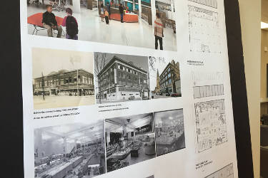 A board showing what early 1900’s department stores looked like and the renderings of the new Forest Home Library’s open space concept. Photo By Dylan Deprey.