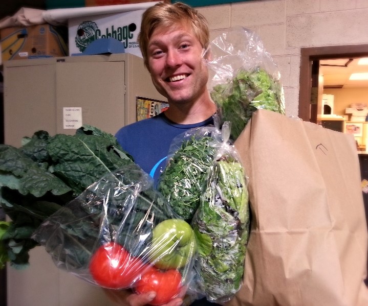 Meet our employee Marcus, modeling a sample of our Spring Full Share (well done, Marcus!). The variety of produce will be different in the summer, but this is to give you an idea of how much food you get in a full share. That grocery bag is full of goodies too- that’s a lot of fresh food!