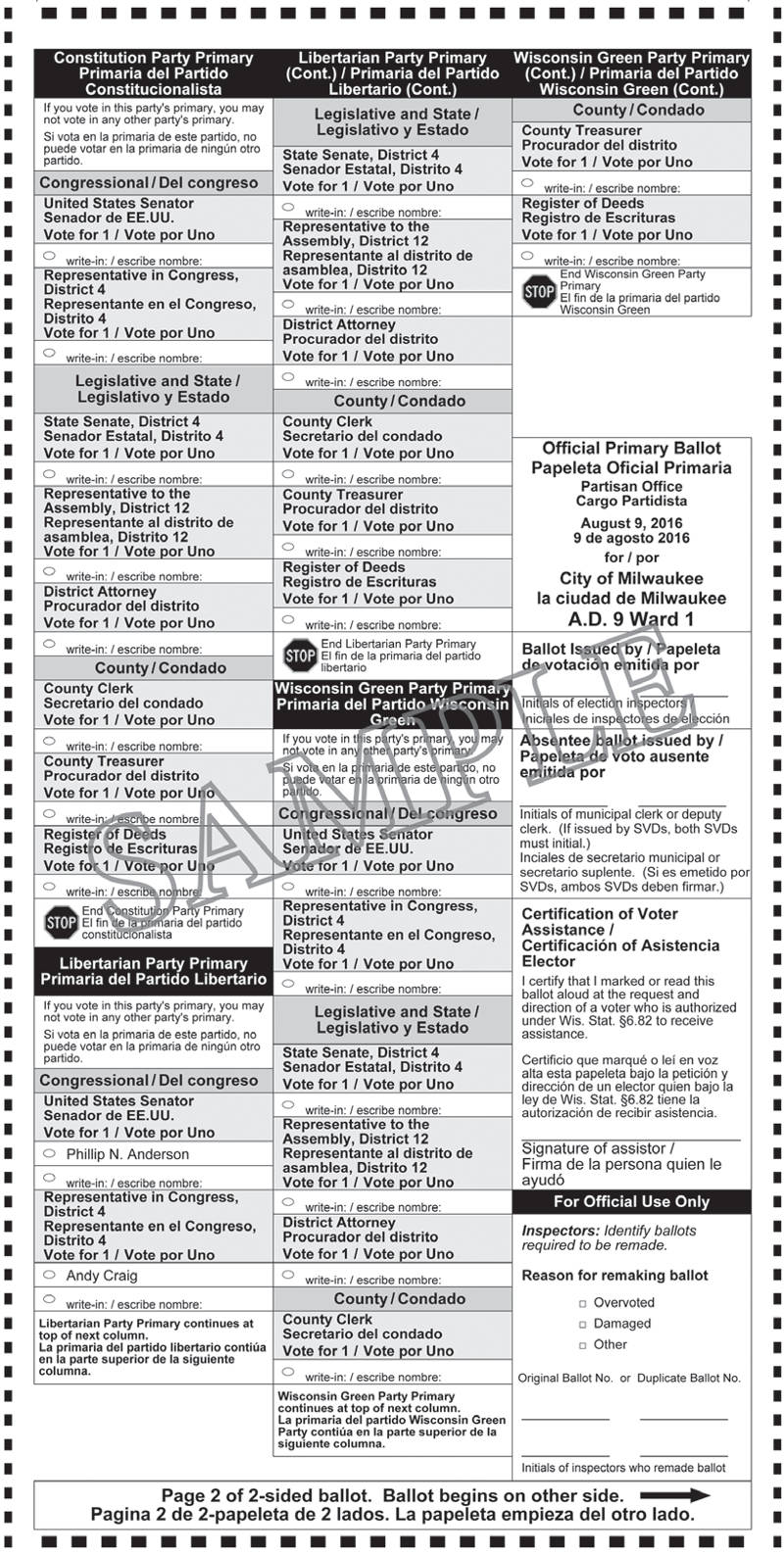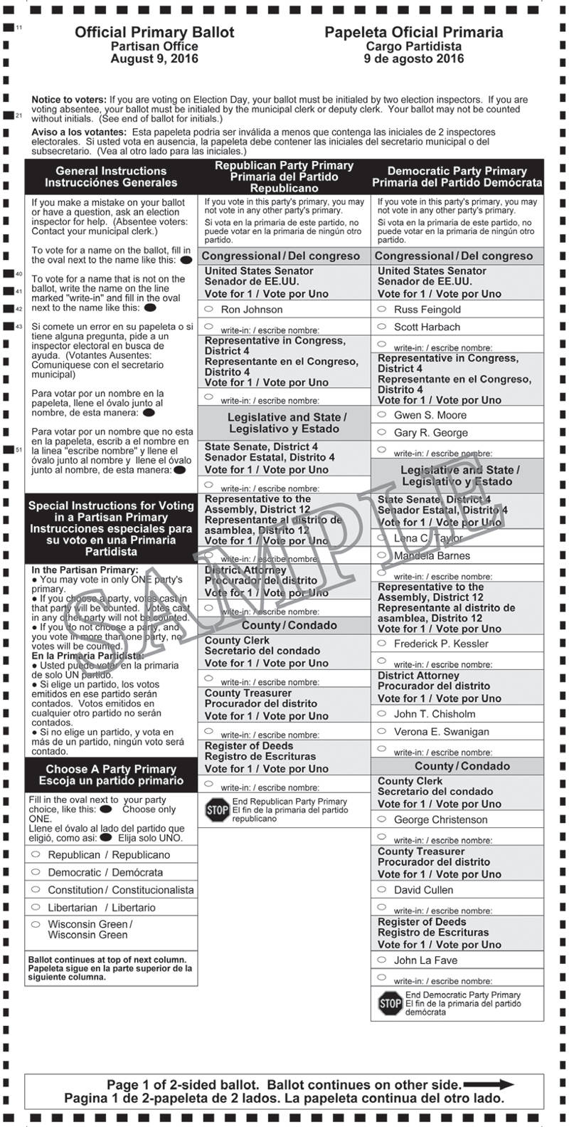 Notice is hereby given of a partisan primary to be held in the City of Milwaukee on August 9, 2016, at which the nominees for the offices named below shall be chosen. The names of the candidates for each office, whose nominations have been certified to or filed in this office, are given under the title of the office under the appropriate party or other designation, each in its proper column, in the sample ballot included with this notice.