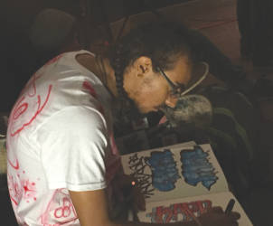 Airbrush and graffiti artist Hector Lopez drawing sketches during the Unfinished Legacy clothing line release. (Photo By Dylan Deprey)