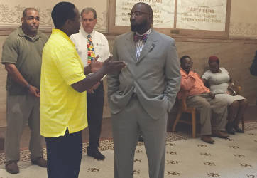 Common Council President Ashanti Hamilton and Pastor Robert Randolph nconversing before the announcement. (Photo By Dylan Deprey)