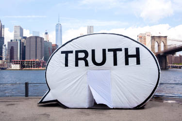 Currently and throughout the remainder of 2016, The Cause Collective will tour 24 U.S. cities as part of their project In Search of The Truth (The Truth Booth). At each location, The Collective invites people to sit inside The Truth Booth (a giant, inflatable sculpture in the shape of a cartoon speech bubble with the word “Truth” printed on the side) and complete the sentence, “The truth is…” while being videotaped. All events are free and open to the public, with new locations and venues to be announced as the tour progresses.