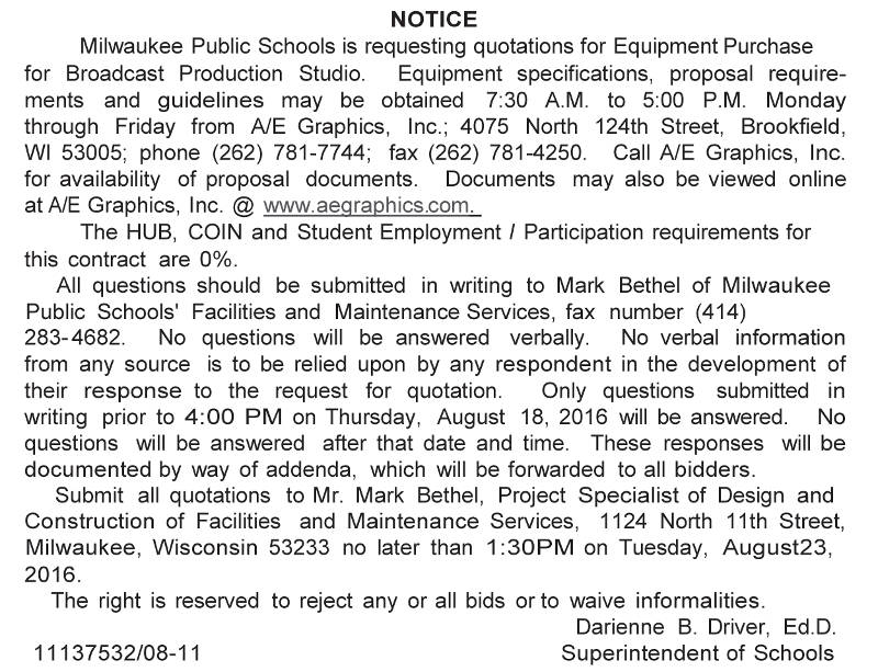 Share: Click to share on Facebook (Opens in new window) Facebook Tweet Click to email a link to a friend (Opens in new window) Email Click to print (Opens in new window) Print MPS Requesting BIDs for Equipment Purchase for Broadcast Production Studio August 13, 2016 Share: Click to share on Facebook (Opens in new window) Facebook Tweet Click to email a link to a friend (Opens in new window) Email Click to print (Opens in new window) Print