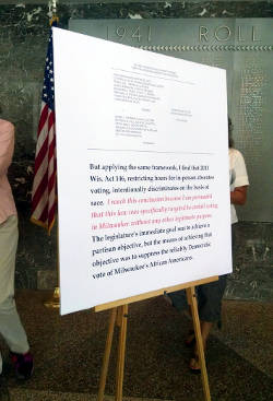On the last Friday of July 2016, Judge Peterson deemed these restrictions intentionally discriminatory towards African Americans, and declared that for the November election voting hours to re-extend to evening and weekends. Starting at 11:30 a.m. at the Frank P. Zeidler Municipal Building, Barrett spoke and was joined by community leaders from Citizens Action of Wisconsin, ACLU of Wisconsin, One Wisconsin Now and Wisconsin League of Women Voters. Barrett said that eliminating weekend voting hours and requiring photo ID laws is discriminatory and makes it harder on Democrats to vote.