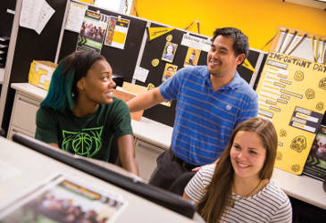 Chue Vang consults with colleagues Brianna Suggs (left) and Marlee Giacometti (right). Vang is a full-time financial-aid advisor at UWM. Suggs and Giacometti are student workers in the financial aid office.