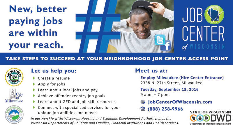 As a Milwaukee native who takes great pride in Milwaukee’s sense of value, friendship and commitment to community, I am pleased to announce that the Department of Workforce Development (DWD) will bring Job Center Services to specific Milwaukee neighborhoods through Job Center Access Points. The first event will be held from 9 a.m. to 7 p.m. on Tuesday, September 13 at Employ Milwaukee, located at 2338 North 27th St. If you happen to have a resume on paper or a flash drive, please feel free to bring it along with you to the event.