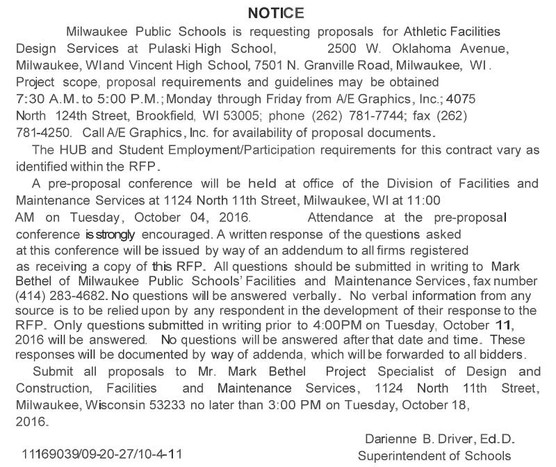 Share: Click to share on Facebook (Opens in new window) Facebook Tweet Click to email a link to a friend (Opens in new window) Email Click to print (Opens in new window) Print MPS Requesting Proposals for Athletic Facilities Design Services at Pulaski High School September 24, 2016 Share: Click to share on Facebook (Opens in new window) Facebook Tweet Click to email a link to a friend (Opens in new window) Email Click to print (Opens in new window) Print