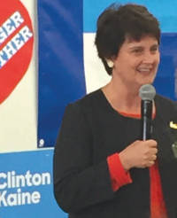 Anne Holton, wife of Democratic Vice President nominee Tim Kaine addresses crowd at Milwaukee Early Voting event. (photo by Karen Stokes)