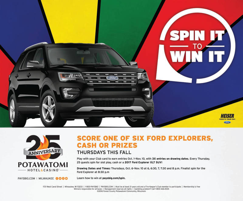Share: Click to share on Facebook (Opens in new window) Facebook Tweet Click to email a link to a friend (Opens in new window) Email Click to print (Opens in new window) Print Spin It To Win It Thursdays This Fall at Potawatomi Hotel & Casino October 1, 2016 Share: Click to share on Facebook (Opens in new window) Facebook Tweet Click to email a link to a friend (Opens in new window) Email Click to print (Opens in new window) Print