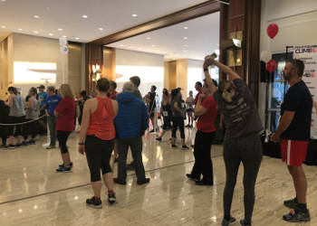 Every 10 flights, water was provided for the climbers if they chose to stop and take a sip. Before each wave of climbers began, they were given a quick warm up with two volunteers to get their body stretched out for the big climb.