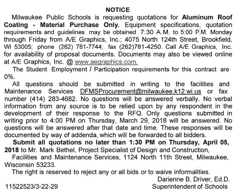 Share: Click to share on Facebook (Opens in new window) Facebook Tweet Click to email a link to a friend (Opens in new window) Email Click to print (Opens in new window) Print MPS Requesting Quotations for Aluminum Roof Coating – Material Purchase Only March 24, 2018 Share: Click to share on Facebook (Opens in new window) Facebook Tweet Click to email a link to a friend (Opens in new window) Email Click to print (Opens in new window) Print