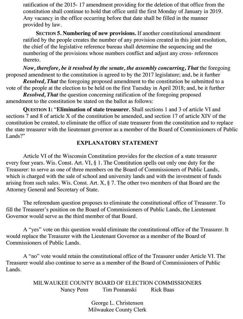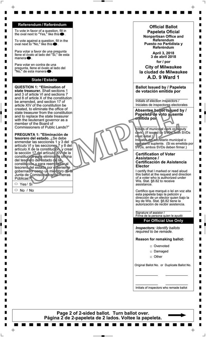 Notice is hereby given of a spring election to be held in the City of Milwaukee on April 3, 2018, at which the officers named below shall be chosen. The names of the candidates for each office to be voted for, whose nominations have been certified to or filed in this office, are given under the title of the office, each in its proper column, together with the questions submitted to a vote, for a referendum, if any, in the sample ballot included with this notice.
