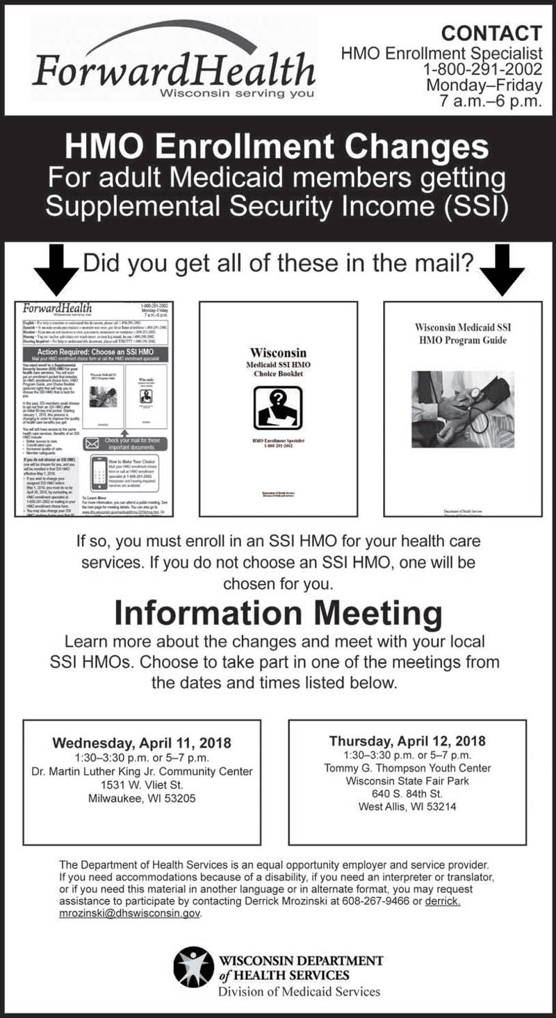 Share: Click to share on Facebook (Opens in new window) Facebook Tweet Click to email a link to a friend (Opens in new window) Email Click to print (Opens in new window) Print HMO Enrollment Changes for Medicaid members getting SSI – Information Meetings April 11 & 12 April 6, 2018 Share: Click to share on Facebook (Opens in new window) Facebook Tweet Click to email a link to a friend (Opens in new window) Email Click to print (Opens in new window) Print