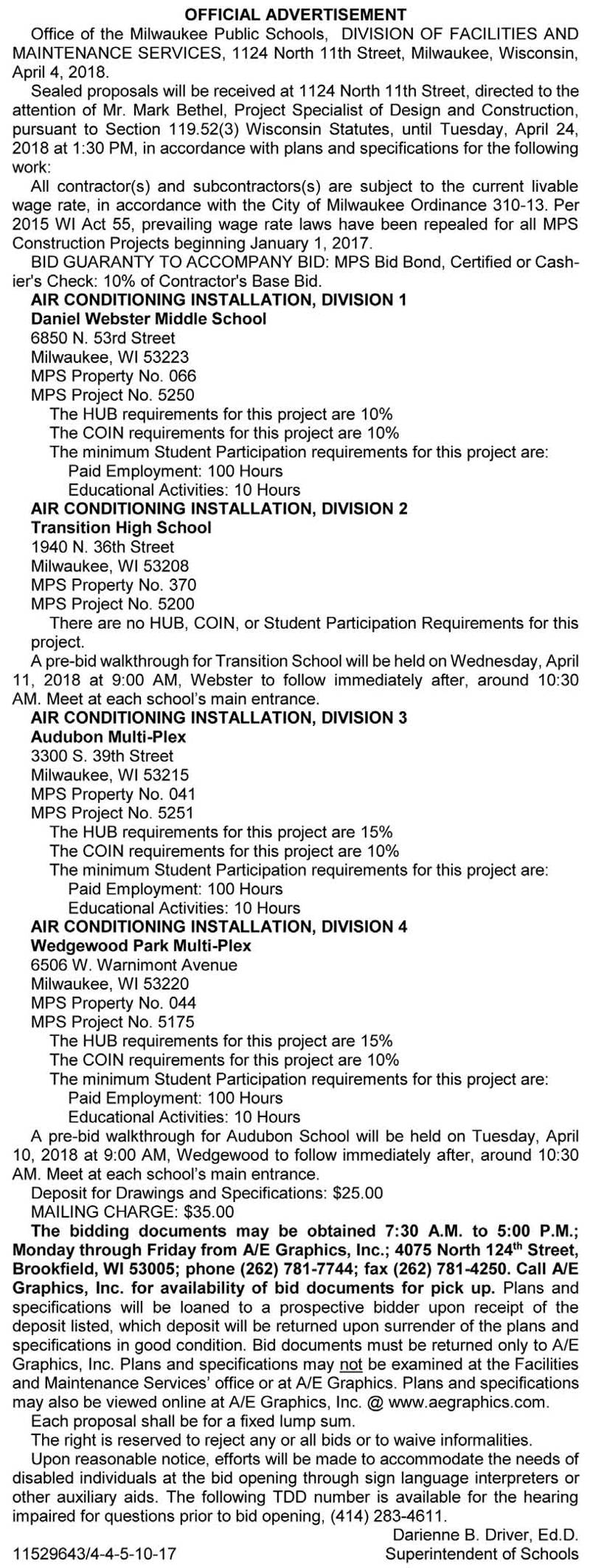 Share: Click to share on Facebook (Opens in new window) Facebook Tweet Click to email a link to a friend (Opens in new window) Email Click to print (Opens in new window) Print MPS Requesting BIDs for Air Conditioning Installations at Multiple Schools April 6, 2018 Share: Click to share on Facebook (Opens in new window) Facebook Tweet Click to email a link to a friend (Opens in new window) Email Click to print (Opens in new window) Print