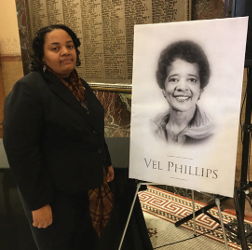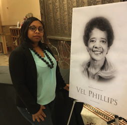 Alderwoman Chantia Lewis stands next to a photo of Vel Phillips, who passed away Tuesday at the age of 94. (Photo by Evan Casey)