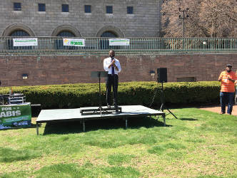Rep. David Bowen speaks to protestors at the 8th annual Cannabis March in Milwaukee last Saturday. (photo by Evan Casey)